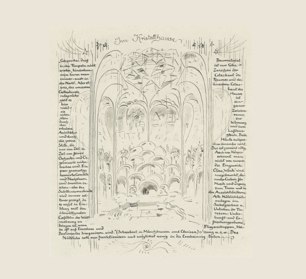 2 “[…] the glass-crystal metaphor had generally been expressed through more or less architectonic concepts. But with alchemy and later the Romantic and Symbolist movements, the imagery of transformation shed most of its architectural manifestation. It became a rudimentary pebble, an image of the soul or brain as this symbol became identified solely with the transformation of the self. The return in the early 20th century to the older, more architectonic, format in the works of Scheerbart, Taut, and a large number of other Expressionists signified a turning away from introspection toward a search for social identity and community.” Excerpt from: Rosemarie Haag Bletter, “The Interpretation of the Glass Dream-Expressionist Architecture and the History of the Crystal Metaphor, Journal of the Society of Architectural Historians 40, no. 1 (1981): p.20‒43.”