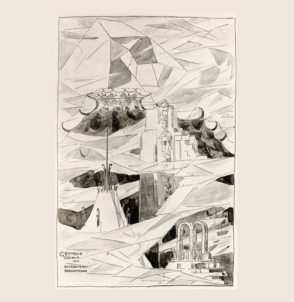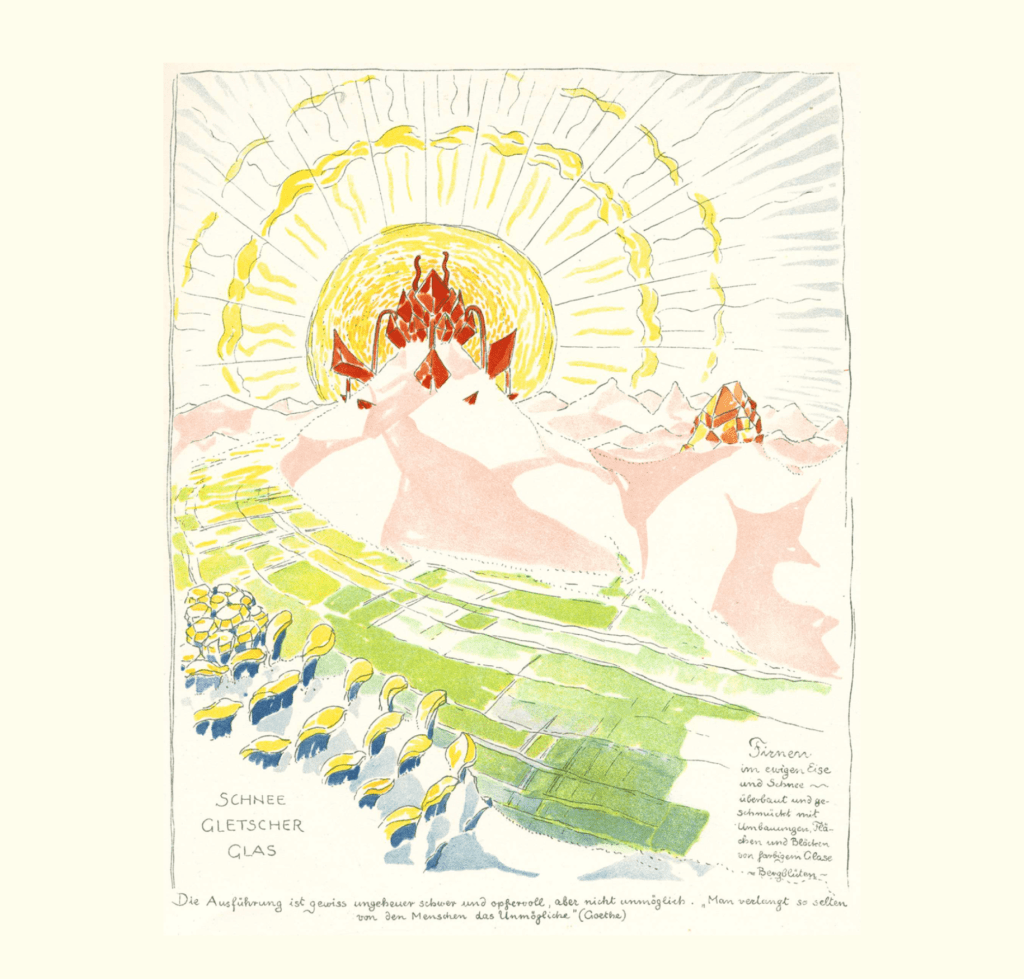 Featured Figure: Portrait of Paul Scheerbart. Photograph by Wilhelm Fechner, 1897. / Figures above are retrieved from: “Taut, Bruno. Alpine Architektur: In 5 Teilen und 30 Zeuchnungen. Hagen: Folkwang Verlag, 1919.” Watercolour and India ink. Fig.1: Teil 4. Kristallhaus. Fig.2: Teil 7. The Crystal Mountain. “Above the vegetation the rock is rough- hewn and smoothed into many crystalline shapes. The snowy summits in the background are crowned by glass-arch architecture. In the foreground pyramids of crystal needles. Over the ravine a trellis-like glass bridge.” 49.5 x 50 cm. Fig.3: Teil 9. Architektur der Berge. Fig.4: Teil 6. Architektur der Berge. Fig.5: Teil 10. Snow Glacier Glass. “Snowfields in the eternal ice and snow ‒ built up and decorated by superstructures. Surface and blocks of colored glass. Mountain blossoms. The execution is certainly very difficult but not impossible. ʻVery rarely is the impossible asked of menʼ (Goethe).” 46 x 41.5 cm. Fig.6: Teil 8. Architektur der Berge. Private Collection, Berlin.