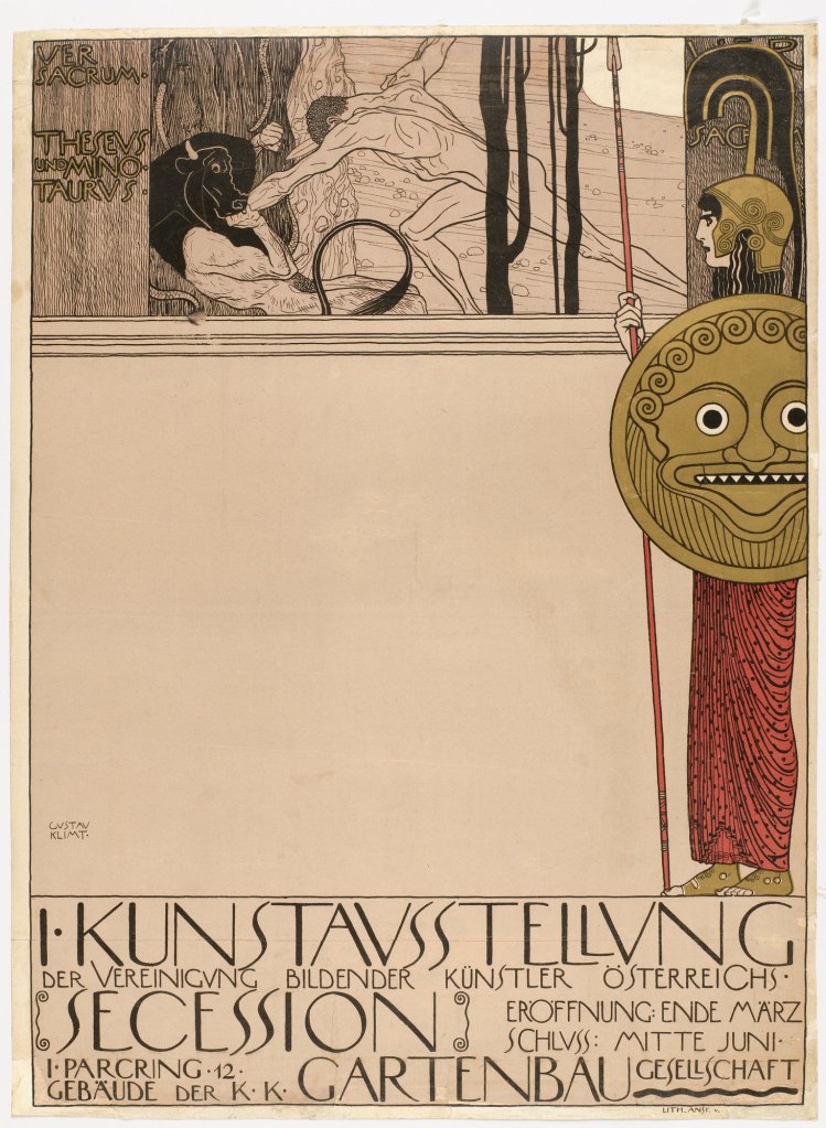 As empty as Klimtʼs mirror is, so is the interior space of the ʻHouse of the Secessionʼ, the associationʼs hub and exhibition hall designed by Olbrich in 1898 (Figure 7). Reflecting the uncertainty that surrounded the concretization of modern identity, this space pioneered the use of movable partitions and therefore justified the Secessionʼs motto: “To every age its art. To every art its freedom.”, which is written above the buildingʼs entrance. Being a place that welcomed the manifold image sought in art, it simultaneously offered refuge from modern urban lifeʼs turmoil, which, as argued by the Austrian painter Oskar Kokoschka (1886-1980), allowed man “to pause for a moment of inward contemplation and dialogue with our own soul.”18 As discussed, it is this search for introspection that allows us to make a bridge between both psychological and architectural developments. As for the psychoanalyst, the Secessionʼs aim was to remove the mask that suppressed the modern spirit, which was in their case an “obsolete, inebriated mix-up of styles” being of a historicist nature, as argued by Hoffmann in 1897.19 While the former uses a set of theories and therapeutical techniques in order to study the unconscious mind and bring such phenomena to the surface, it was through the medium of architecture (and other forms of visual expression) that the latter intended to bring the modern spirit to the fore. Architecture was in this case used as an ʻinstrumentʼ, a method of working, through which a mental state could be enhanced; an act which can be defined as ʻmodernʼ, since the building (the perceived) is subordinated to its content (the perceiver). Through this process, the attention is automatically drawn away from the building itself as the point of reference; leading to a valuation of an environment in which external stimulants are regulated. In the case of the historicist styles that characterized the Viennese building code, and particularly the ʻRingstraßenstilʼ [Ring Road style] which was developed during the second half of the 19th century, such a sensory overload of eclectic decoration displaces the center point of attention to its appearance and therefore drags manʼs conscious attention outside of the self; prioritizing the ʻmaskʼ as opposed to that which lays behind it. Being the Viennese variant of the Jugendstil, the Secession obviously did not reject the use of ornament in architecture. However, it was through its treatment that the Secessionists portrayed its opposing force, namely: plainness. The duality between both empty and rich surfaces can for example be found in Klimtʼs ʻTheseus and the Minotaurʼ, the poster for the First Secession Exhibition of 1897 (Figure 9), as well as the Façade arrangement of the House of the Secession itself. In both instances, decoration is used in order to frame and accentuate a centralized unadorned plane, once again orchestrating the empty space within. This value was also acknowledged by Hoffmann, who claimed that the bare wall was ʻsacredʼ to them.20 Although conforming to a Jugendstil format, these manipulations can be seen as first signs of a new visual language based on the fundamental thought to regulate external stimulants to a bare minimum in order to create cleanliness and neutrality; turning the object of perception into a refuge for the mind.