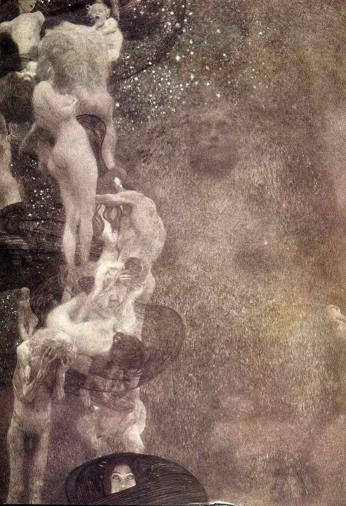 Having framed the Secessionʼs embracement of the gesamtkunstwerk as the physical manifestation of a utopian idealism, we will now introduce a figure whose oeuvre surrounds this phenomenon and undoubtedly influenced the Viennese avant-garde: the German composer and theater director Richard Wagner (1813-1883). His direct influence on the Secession can be found in his ʻBeethovenʼ essay of 1870, wherein he declared the following: “So does music now break forth from amidst the chaos of modern civilization. Both say to us: Our kingdom is not of this world. Which means: We come from within, you from without; we spring from the essence of things, you from the appearance.” Apart from a direct connection with the third panel of Klimtʼs Beethoven Frieze in terms of its title, the differentiation between an esoteric and exoteric existence is continued in the work of the Secessionists, embracing the notion that the modern spirit can only exist if it, like an embryo, unfolds from within.