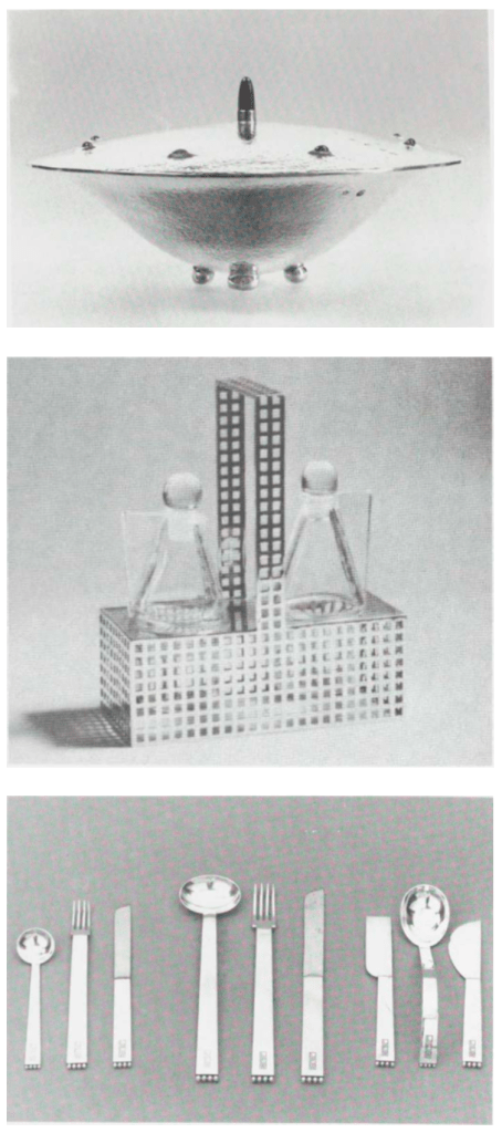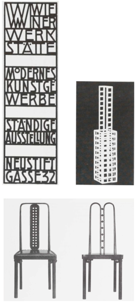 Figure 15 (left): Wiener Werkstätte. Postcard, 1909. Lithography, 14 x 18.9 cm. Fischer Fine Art, London. Figure 16 (left): Josef Hoffmann. Vase, 1905. Painted Sheet Metal, 24.5 cm in Height. Private Collection. Figure 17 (left): Josef Hoffmann. Chairs: ʻPurkersdorfʼ (1904), Wood and Leather, 100 x 45 x 43 cm, The Museum of Modern Art, New York. ʻSieben Kugelnʼ (1906), Wood and Leather, 111.8 x 41.9 x 40.7 cm. Sammlung Tim Chu. / Figure 18 (right): Josef Hoffmann. Bowl, 1903-1905. Hammered Silver, 9.2 cm in Height, 20.3 cm in Diameter. Private Collection. Figure 19 (right): Koloman Moser. Vinegar & Oil Set, 1904-1905. Silver and Glass, 17.2 cm. Private Collection. Figure 20 (right): Josef Hoffmann. Cutlery for Lilly and Fritz Wärndorfer, 1906. Middle Set: Spoon, 21.8 cm, Fork, 21.6 cm, Knife, 21.5 cm. Österreichisches Museum für angewandte Kunst/Gegenwartskunt (MAK). Figure 15-20: Wien 1900: Kunst, Arkitektur & Design, 1987.