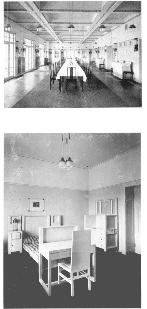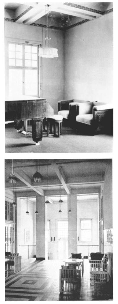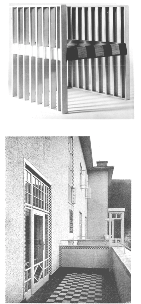 In all of the above examples, we are able to trace the ʻperformanceʼ of the space back to a basic metric system that consists of horizontal and vertical lines, square and rectangular surfaces, as well as cube and cuboid volumes, wherein each of those three dimensions is respectively part of the other, creating a self-referential vocabulary of geometrical entities. This interrelation between elementary forms results in a spatial continuity, since every domain is a succession of the other, or in the words of the architect Peter Behrens (1868-1940), “dependent and related to a higher totality”.54 As seen in an interior shot of the music room (Figure 30), each subdivided shape or space is emphasized individually by marking the outlines of its territory, which is in this case done by stenciled friezes and miniature tiled outlines on the walls. In doing so, the emphasis is constantly laid upon the empty space within each fragment, which as seen in the House of the Secession, allows the observant to find a ʻframeʼ in which the mind can ʻdwellʼ. So, by accentuating the elementary forms that exist within the continuity of line-shape-volume, a rhythm between identical patterns becomes visualized. This repetition is then continued into different design-facets (e.g., furniture, lightning and cutlery) and is thus the ʻpulseʼ that reverberates throughout the sanatorium; creating a work in which a pattern of form is echoed into the tinniest of details. If we trace this patterning back to the basic polarity of the metric system, that of horizontals and verticals, we are able to extract a tension that through its opposing nature constitutes a vital balance among forces. Or in other words, through contrast harmony is achieved (yin and yang). This patterning of contrasts can for example be seen in the entrance hall of the sanatorium (Figure 31), where different opposing forces come to the fore. Here, the planarity of two- dimensional surfaces contrasts with the tectonic appearance of the coffered ceiling, while the plainness of those surfaces also counterpoints the delicate elements of the room. Shallowness and depth, as well as vastness and intimacy are thus experienced simultaneously. Further correspondence between elementary forms can be found in the way the vertical rung structure of the Moserʼs white wooden cubic seating matches the proportions of the concrete columns, as well as the long narrow strings of the centrally ordered lamps. These features therefore strengthen a sense of ʻheightʼ, while the gradual alteration of rising floor levels on the other hand orchestrates a sense of ʻdepthʼ. Though, the most direct expression of this interrelation between contrast and rhythm can be found in the roomʼs decorative motifs. As seen in the figure, a black and white tiled floor pattern is applied throughout the hall and mirrors the exposed ceiling beams above, which in turn communicates with the woven chequerboard pattern of Moserʼs seating (Figure 32). The latter is further repeated in the narrow decorative strips of blue and white tiles that outline the blank surfaces of the façades (Figure 33), as well as the floor tiles in the central corridors and staircase. All these patterns unite into a self-referential network of ʻpulsesʼ, wherein each extreme directly communicates with its counterpart; automatically constructing a balance of forces. Now, if we connect this observation to the ʻvitalistʼ belief that disease results from an imbalance of inner forces ‒ which is in line with Bergsonʼs notion of the ʻélan vitalʼ ‒ we are able to read Hoffmannʼs gesamtkunstwerk as an attempt to revitalize this ʻanatomicalʼ balance in the patients by subjecting them to an environment where a union of polarities is thoroughly applied. The repetitive nature of polarities then becomes a ʻmeditativeʼ experience, which is further enhanced by the reflective interplay of light and empty wall-surface; creating a luminous atmosphere that eases the senses and transposes the patients into a self- contained and white-painted washable world.55