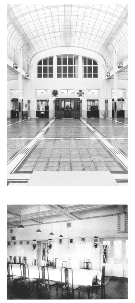 Figure 26 (top far left): Sanatorium Purkersdorf, Interior Shot ʻDining Roomʼ, Photo Documentation by Gunter Breckner in ʻJosef Hoffmann: Sanatorium Purkersdorfʼ, 1985. / Figure 27 (bottom far left): Sanatorium Purkersdorf, Interior Shot ʻGuestroom Second Floorʼ, Photo Documentation by Gunter Breckner in ʻJosef Hoffmann: Sanatorium Purkersdorfʼ, 1985. / Figure 28 (top middle left): Otto Wagner, 1905. The Austrian Postal Savings Bank, Vienna. Interior shot of the ʻKassenhalleʼ. Photograph: Stephen Lewis, 2016 (Date of Post). Retrieved from: Bubkes.Org / Figure 29 (bottom middle left): Sanatorium Purkersdorf, Interior Shot ʻDining Roomʼ, Photo Documentation by Gunter Breckner in ʻJosef Hoffmann: Sanatorium Purkersdorfʼ, 1985. / Figure 30 (top middle right): Sanatorium Purkersdorf, Interior Shot ʻMusic Roomʼ, Photo Documentation by Gunter Breckner in ʻJosef Hoffmann: Sanatorium Purkersdorfʼ, 1985. / Figure 31 (bottom middle right): Sanatorium Purkersdorf, Interior Shot ʻMain Hall to the Eastʼ, Photo Documentation by Gunter Breckner in ʻJosef Hoffmann: Sanatorium Purkersdorfʼ, 1985. / Figure 32 (top far right): Armchair, 1903, Prag-Rudniker, painted beech, caned seat. Design by Koloman Moser. Photo Documentation by Gunter Breckner in ʻJosef Hoffmann: Sanatorium Purkersdorfʼ, 1985. / Figure 33 (bottom far right): Sanatorium Purkersdorf, Interior Shot ʻTerrace First Floorʼ, West Façade. Photo Documentation by Gunter Breckner in ʻJosef Hoffmann: Sanatorium Purkersdorfʼ, 1985.